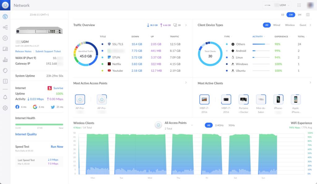 - Des périphériques réseau de type Ubiquiti/Unifi avec une IA et une grande flexibilité de gestion sans lésiner sur la sécurité.